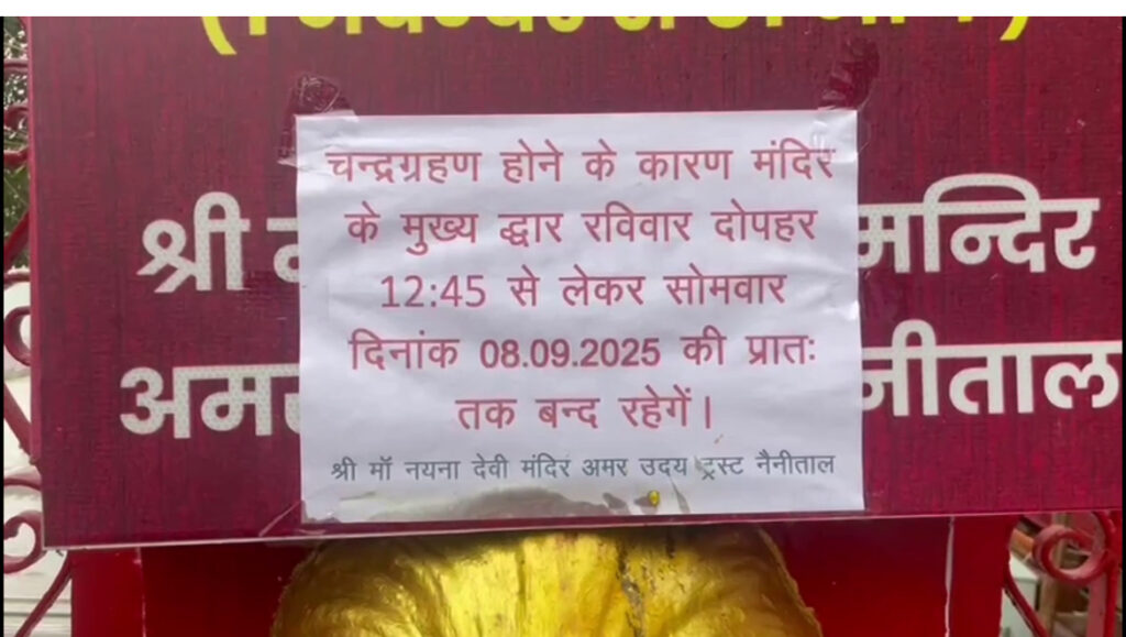नैनीताल: चंद्रग्रहण 2025 के सूतक के चलते विश्व प्रसिद्ध बाबा नीम करौली महाराज के कैंची धाम, नैना देवी मंदिर समेत सभी छोटे बड़े मंदिर के कपाट कल तक के लिए बंद कर दिए हैं. चंद्रग्रहण का सूतक काल खत्म होने के बाद मंदिर प्रांगण को गंगा जल से शुद्ध किया जाएगा. फिर तमाम मंदिरों के कपाट कल सोमवार को भक्तों के दर्शन के लिए खोले जाएंगे.