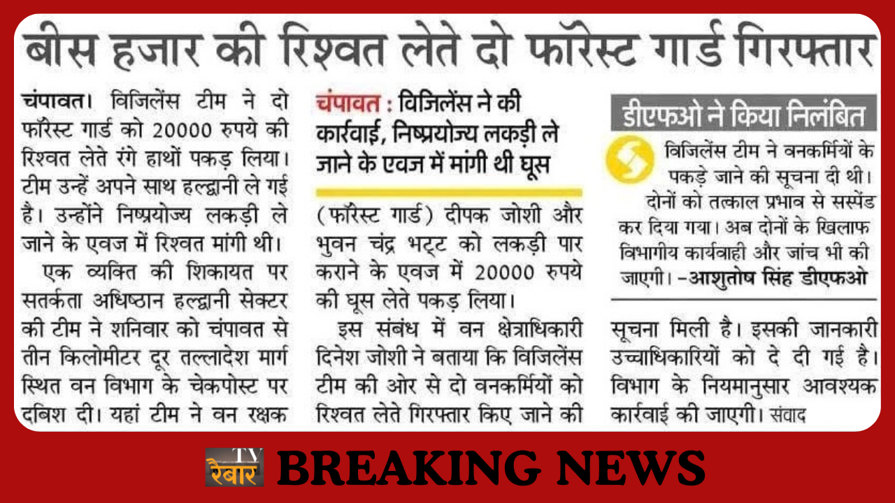 चंपावत (उत्तराखंड): विजिलेंस टीम ने शनिवार को चंपावत जिले में बड़ी कार्रवाई करते हुए दो फॉरेस्ट गार्ड्स को 20,000 रुपये की रिश्वत लेते रंगे हाथों गिरफ्तार किया। दोनों फॉरेस्ट गार्ड्स पर एक निप्रयोज्य लकड़ी ले जाने की अनुमति के एवज में घूस मांगने का आरोप है।
