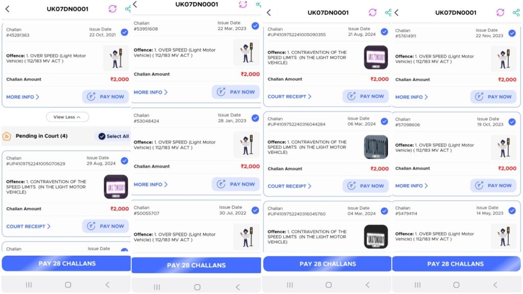 एम-परिवहन ऐप के मुताबिक, इस वाहन पर पिछले 5 वर्षों में 28 चालान दर्ज हैं। ये सभी चालान ओवर स्पीडिंग और पॉल्यूशन से संबंधित हैं। इतना ही नहीं, ये चालान दिल्ली, हरियाणा, उत्तर प्रदेश और उत्तराखंड में जारी किए गए हैं।