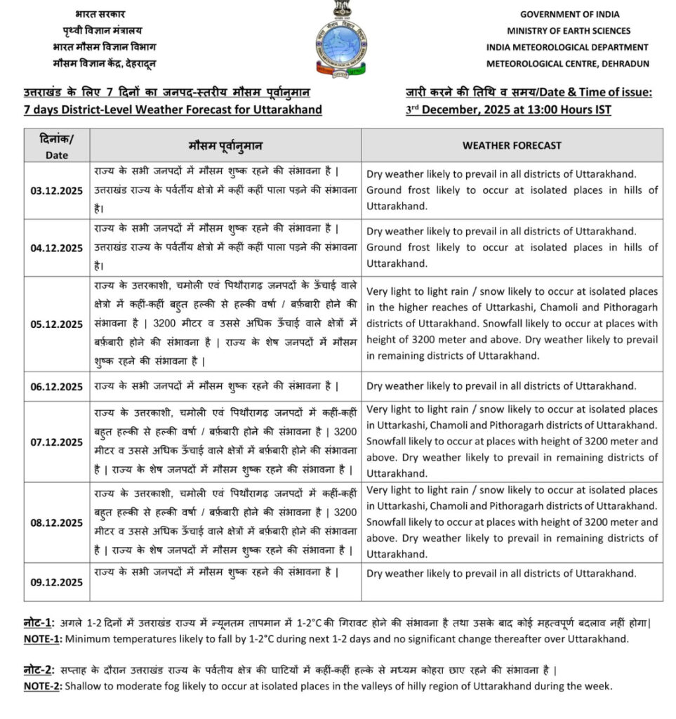 रविवार को फिर से उत्तरकाशी, चमोली और पिथौरागढ़ में बारिश और बर्फबारी होगी, और यही स्थिति सोमवार 8 दिसंबर को भी बनी रहेगी। इसके बाद मंगलवार 9 दिसंबर को मौसम के फिर से शुष्क होने की संभावना है।